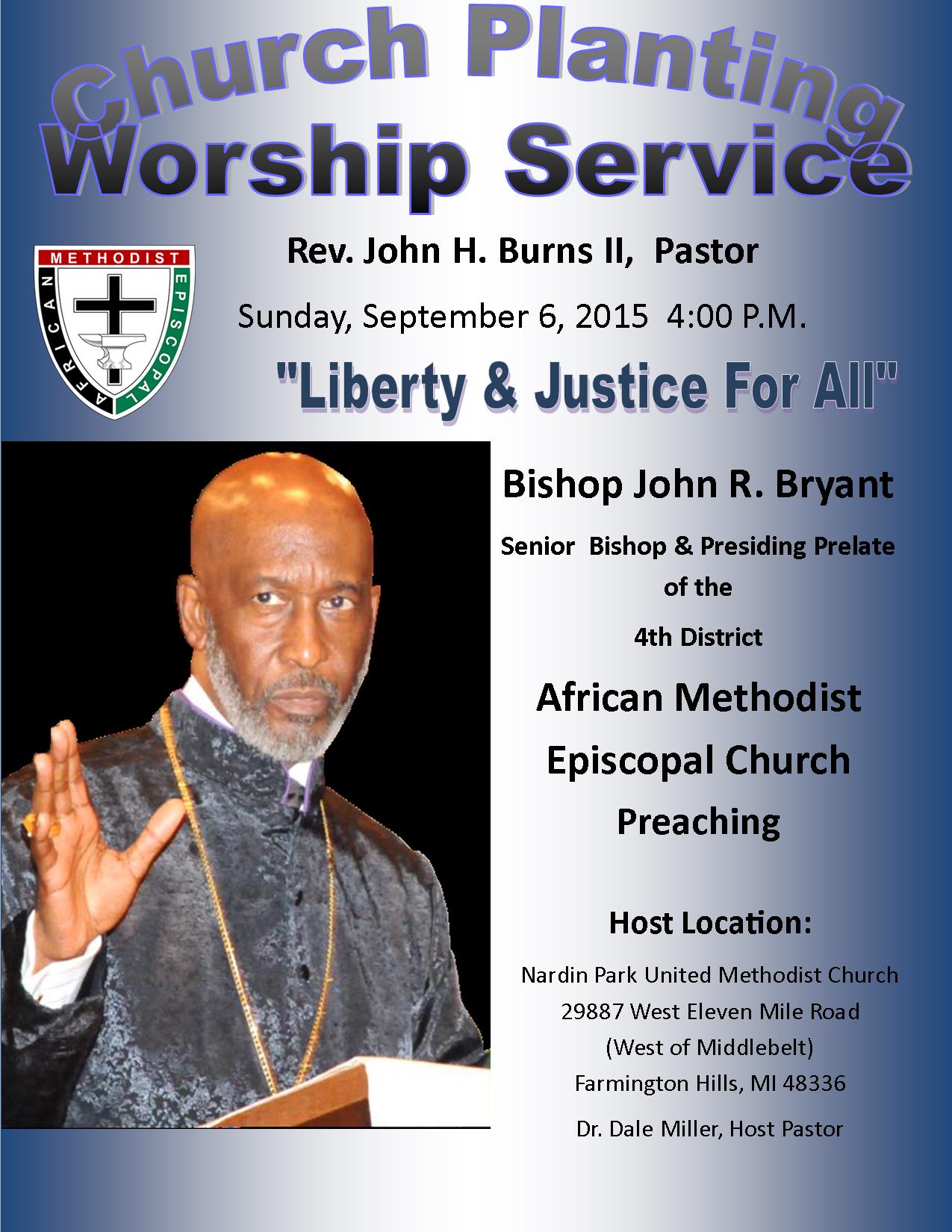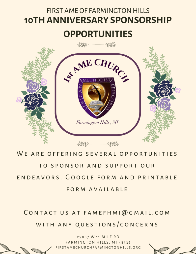 First A.M.E. church began in 2015, when Rev. John H. Burns II and Rev. Dr. Patricia Coleman-Burns began ministering in Farmington Hills. At the time, the A.M.E. Church had little presence in the Farmington, Farmington Hills, Novi, Plymouth, Livonia and Northville areas.