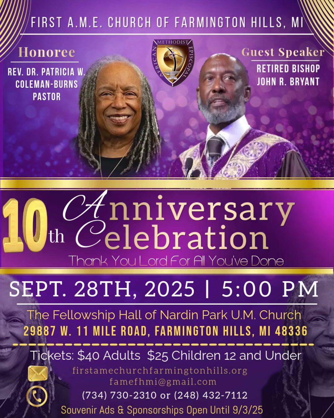 First A.M.E. church began in 2015, when Rev. John H. Burns II and Rev. Dr. Patricia Coleman-Burns began ministering in Farmington Hills. At the time, the A.M.E. Church had little presence in the Farmington, Farmington Hills, Novi, Plymouth, Livonia and Northville areas.
