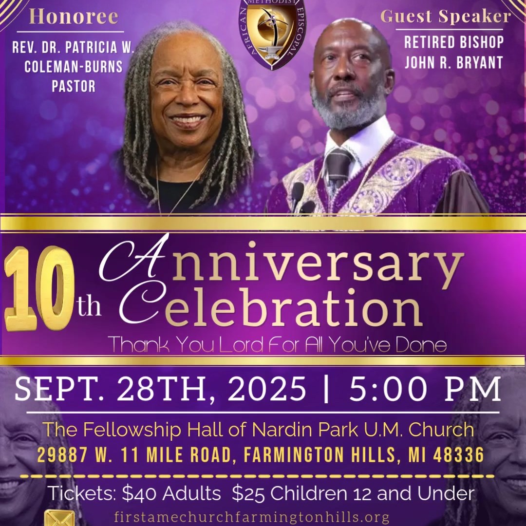Welcome to our vibrant community! We are First A.M.E. (African Methodist Episcopal) Church of Farmington Hills of the Michigan Conference, 4th District. As proud Christians of the Black Methodist and social justice tradition, we invite you to join us in our mission and celebrate our culture. Rev. Dr. Patricia W. Coleman-Burns is our Pastor. Together, we strive to make a positive impact and share the traditions, values, and love that define us. Come join us on our journey.